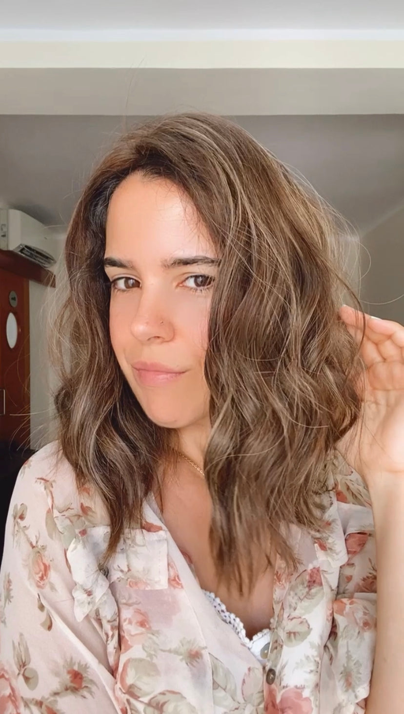 Hair color: An ashy light brown base with cool, muted undertones. The color has a natural, soft glow with subtle highlights that add dimension, especially in the waves. Under the light, you may notice beige or smoky hues, offering a sophisticated and understated look without leaning into warm blondes or deep dark tones.