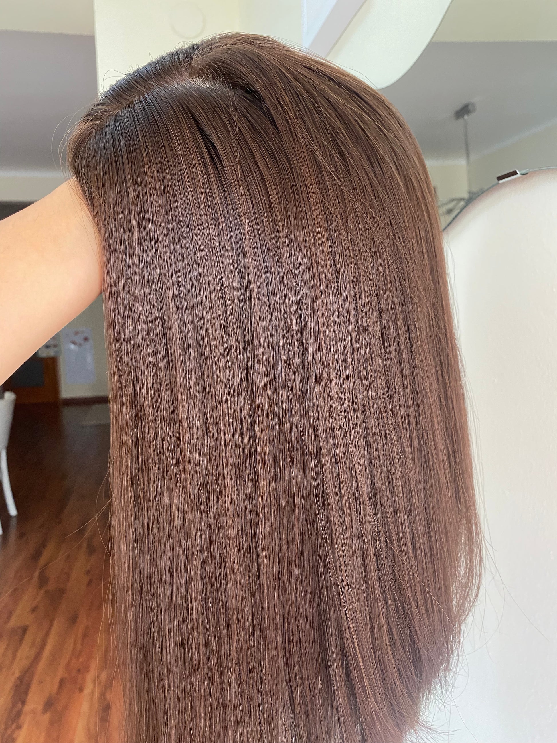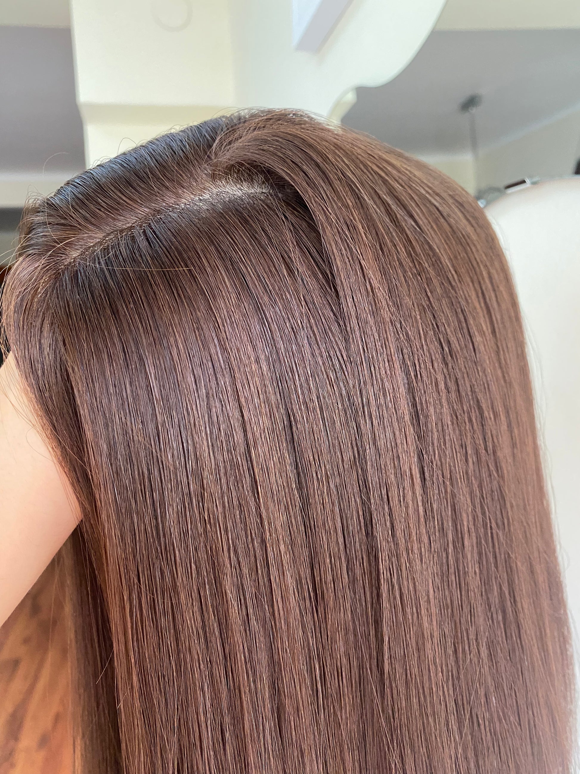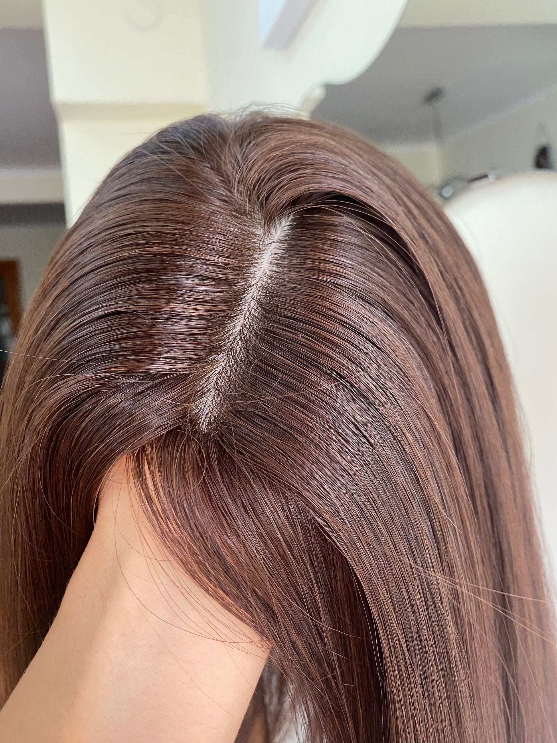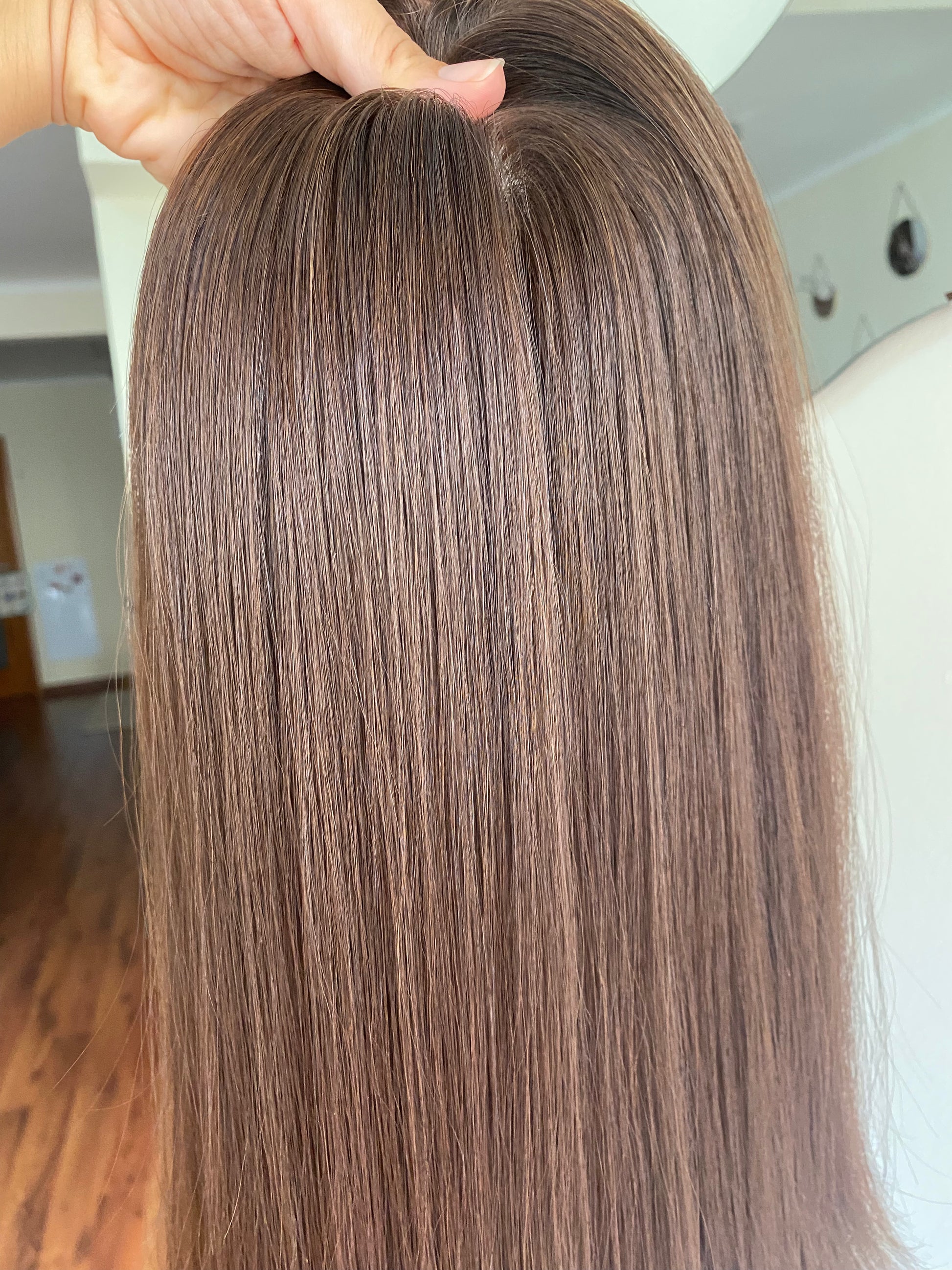 Color: Dimensional light brunette, with subtle warm undertones and natural highlights. Under the light, it reveals a soft warm glow, perfect for a fresh and natural look. The hair and/or the roots can be darkened by an alternative hair specialist, but lightening or bleaching is not recommended.