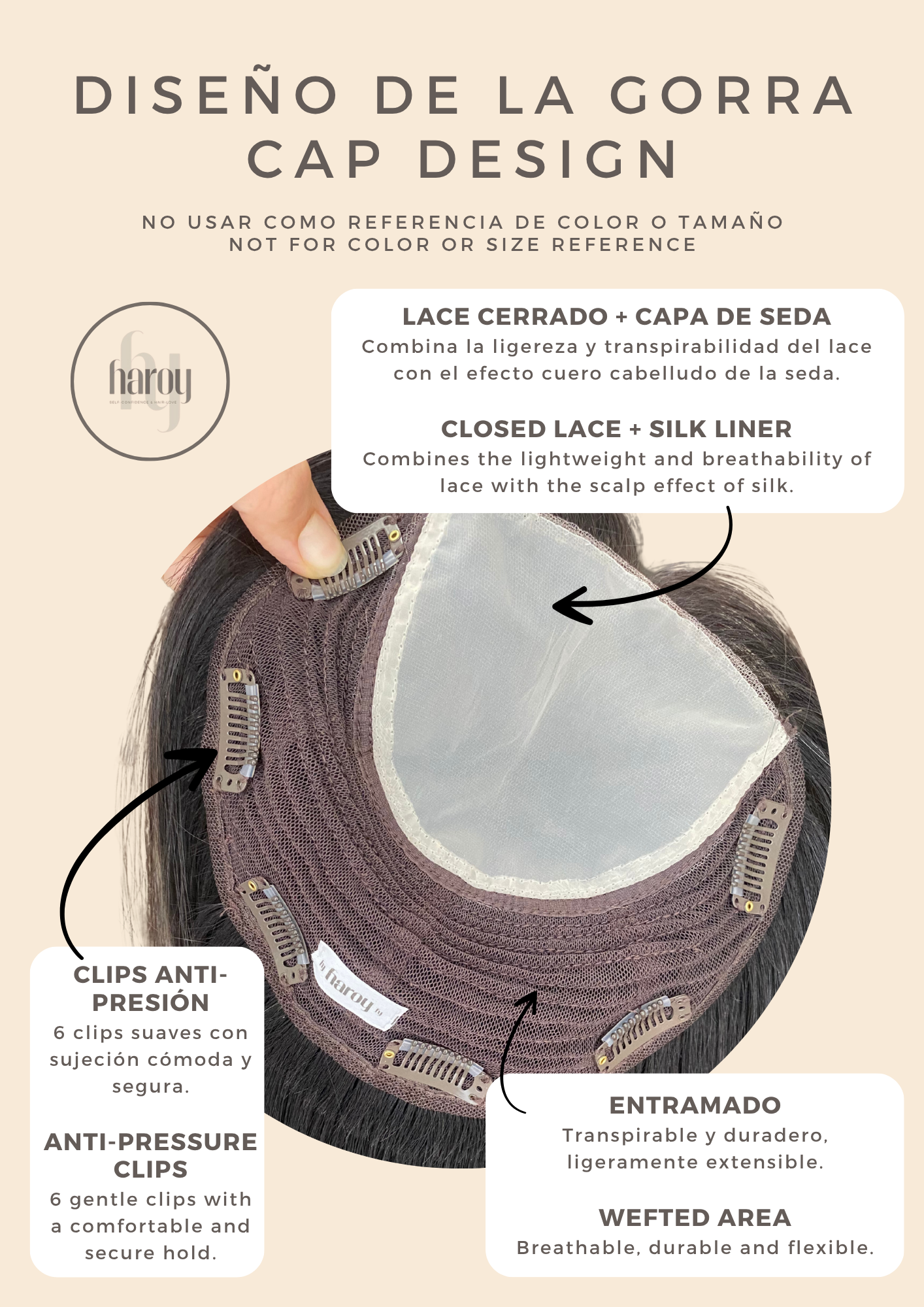 Construcción: Lace cerrado + capa de seda – Combina la ligereza y transpirabilidad del lace con el efecto cuero cabelludo de la seda.